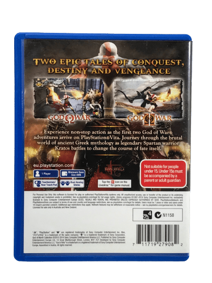 Mint Condition & 100% Complete with Contents: The God of War Collection / God Of War HD Collection for SONY PlayStation Vita / PS Vita. This preowned game is in pristine condition – a tidy and complete collector’s item, with case, cover, and game cartridge. No manual was ever printed or released with this game, but the game is self-explanatory, and the instructions are readily available online.