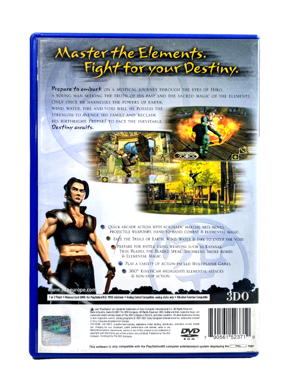 Thus begins the tale of Godai: Elemental Force. The game features fast-paced stealth gameplay, and allows you to engage your enemies with hand-to-hand, sword, and projectile weapon attacks. You’ll set out on a quest through the trials of the four spirit elements (Earth, Wind, Water, and Fire) in 16 breathtaking levels. You can survey your surroundings with a 360-degree cinematic KinetiCam, and make use of eight play modes, one player campaign, and seven styles of two-player head-to-head. The game includes new weather and environmental effects, including night, rain, fog, and “pool of light” sources such as torches, fire pits, etc., that will immerse the player into the story and action. The wide selection of weapons includes katana blades, twin blades, throwing spikes, shuriken, smoke bombs, and elemental magic. Godai: Elemental Force also features a simple pick-up-and-play default control scheme.