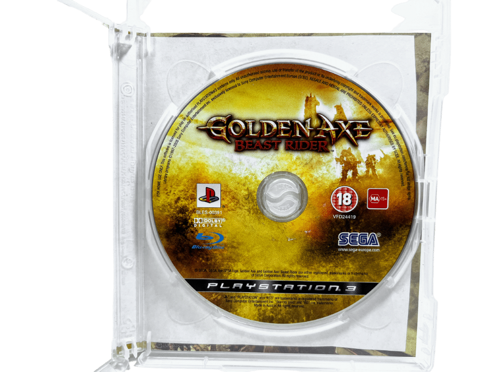 GOLDEN AXE Beast Rider for SONY PlayStation 3 / PS3. This preowned game is in excellent condition and includes case + cover + game disc. sheet of white paper lightly fixed to reverse side of paper cover, but this is easily removeable.
