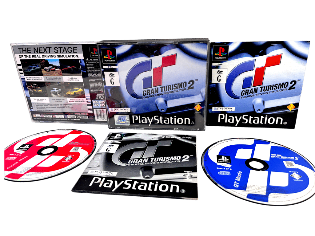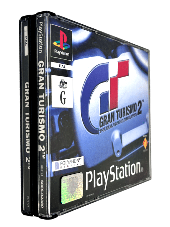 The Original Print (“Black Edition”, non-Platinum) in very good condition & including both discs and the colour instruction manual: GRAN TURISMO 2 for SONY PlayStation / PS1. This preowned game includes each of the case + covers (both front and back cover slips) + COLOUR MANUAL + 2 x game discs. The discs are in good condition with mild markings and faint superficial scratches only, and all other contents are very tidy. The Black and White Manual is NOT included. Only the Colour version of the instruction manual.