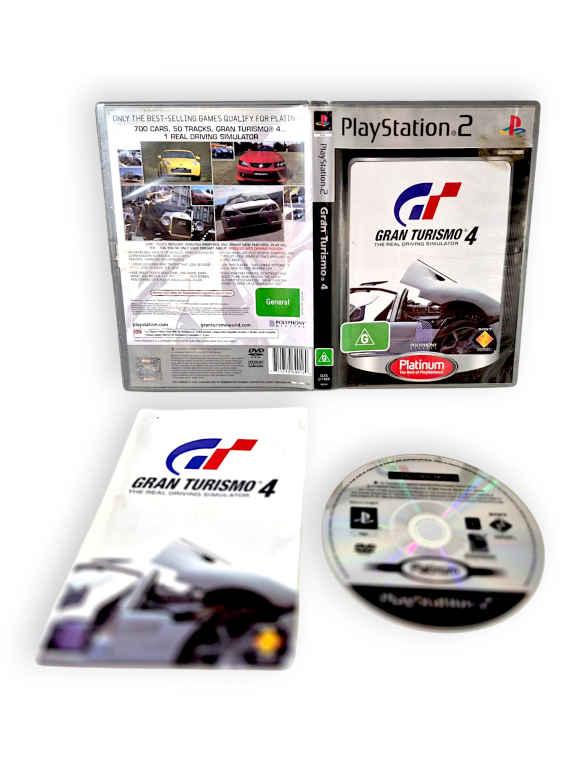 DESCRIPTION: This complete Platinum edition of Gran Turismo 4 includes the case, disc, and manual, representing one of the most ambitious driving simulators ever released on PS2. Featuring over 700 cars and 50 tracks, it delivers immense depth through tuning, licensing tests, endurance events, and photo mode. The game’s physics engine and visual fidelity pushed the PS2 hardware to its limits, earning widespread acclaim. With a vast single‑player structure and meticulous attention to automotive detail, GT4 remains a cornerstone title for racing enthusiasts and a highly collectible entry in the franchise.