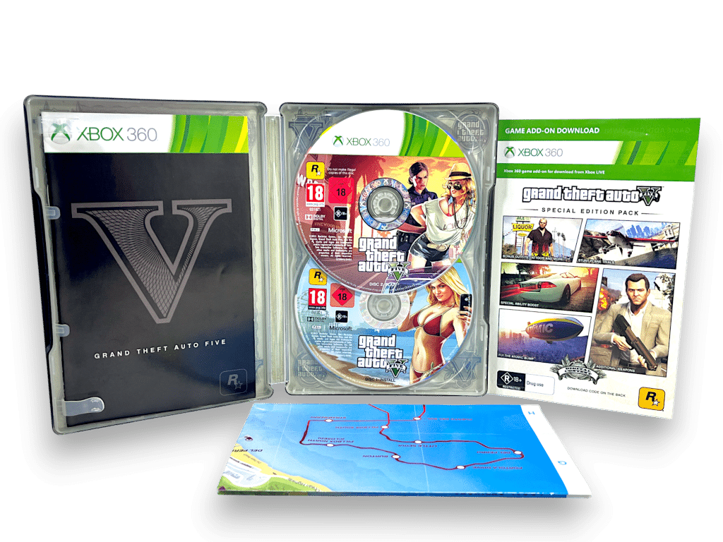 Rare Authentic Limited Steel Case Collector’s Edition in excellent condition & 100% complete with ALL contents, including manual + map + promo card: Grand Theft Auto 5 / GTA V / GTA 5 for XBox 360. This preowned genuine Steelbook Collector’s Limited Edition is in superb condition with only very mild steel case surface imperfections, and comes complete with each of the Steel Case + BOTH (2) x game discs + Manual / Booklet + MAP + promo card. A lovely collector’s item.