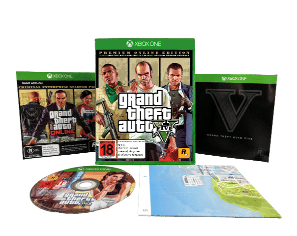 “PREMIUM ONLINE” EDITION Cover Variant complete with BOTH map AND manual: Grand Theft Auto 5 / GTA V / GTA 5 for Xbox One. This preowned game comes complete with case, manual / booklet, MAP, and game disc each in Excellent Condition. The paper cover has some light paper creasing, but this is a very minor imperfection, and each of the internal contents is in superb condition. Voucher card not included, but this was a promotional download only and is not required for gameplay or completion. The FULL Grand Theft Auto 5 game is included on the game disc.