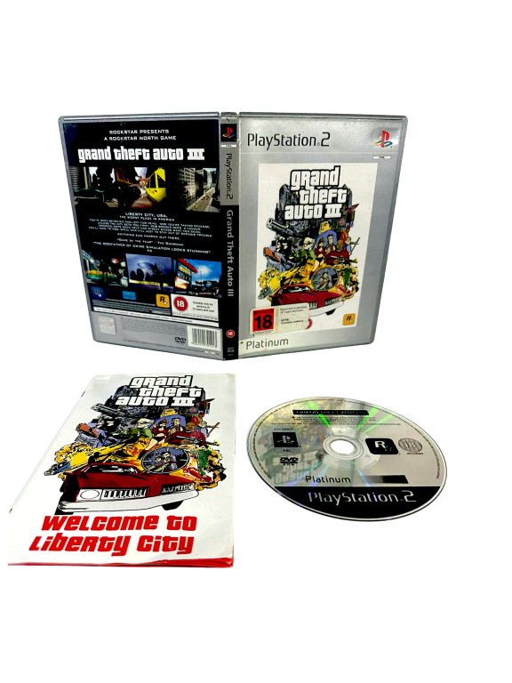 Grand Theft Auto III (PS2). This preowned game is in good condition with mild disc surface imperfections only which do not hinder gameplay or performance in any way. This game includes pictured contents. Refer photographs.