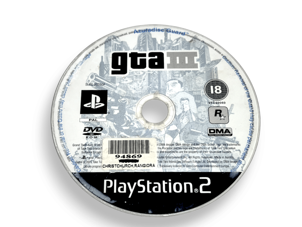 Grand Theft Auto III (PS2). This preowned game disc is in very good condition with only mild disc surface imperfections. This game disc comes inside an empty blank case. Please note that the original case is not included.