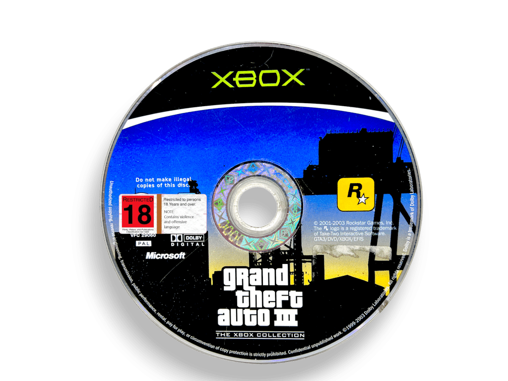 Grand Theft Auto III (Xbox). This preowned game disc is in very good condition with only mild disc surface imperfections. This game disc comes inside an empty blank case. Please note that the original case is not included.