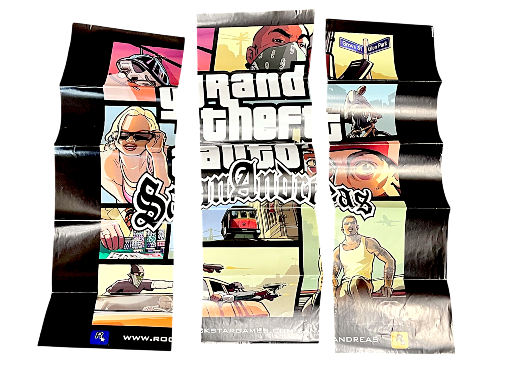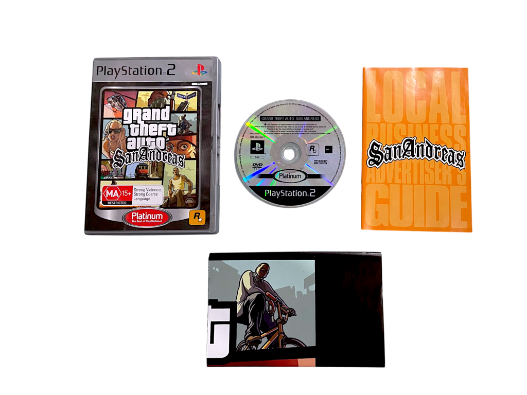 Grand Theft Auto: San Andreas (PS2) *COMPLETE*. This pre-owned SONY PlayStation 2 game is in good condition with mild markings and light superficial surface scratches only which are purely cosmetic and do not hinder gameplay or performance in any way. This game includes pictured contents. Refer photographs. NOTE THAT THE MAP IS SEGMENTED – the three sections have come apart – but the full map is there.