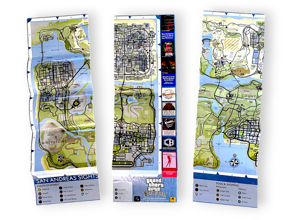 Grand Theft Auto: San Andreas (PS2). This preowned SONY PlayStation 2 game disc is in excellent condition and includes case + cover + game disc + Map (which is split into three different segments).
