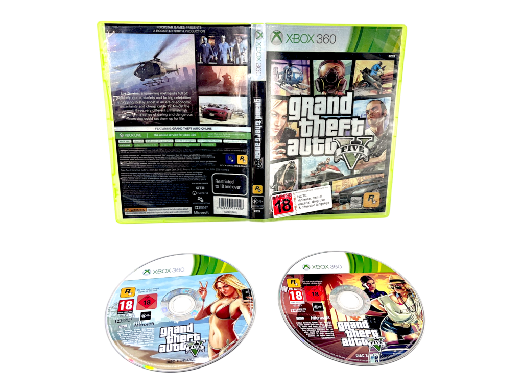 Grand Theft Auto V (Xbox 360 Complete 2-Disc). This pre-owned game is in good condition with light scratches on the discs only which do not hinder performance or gameplay in any way. This game includes the pictured contents. Refer photographs.