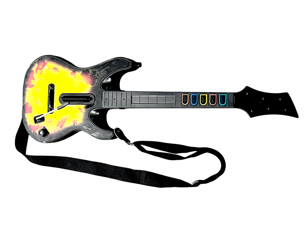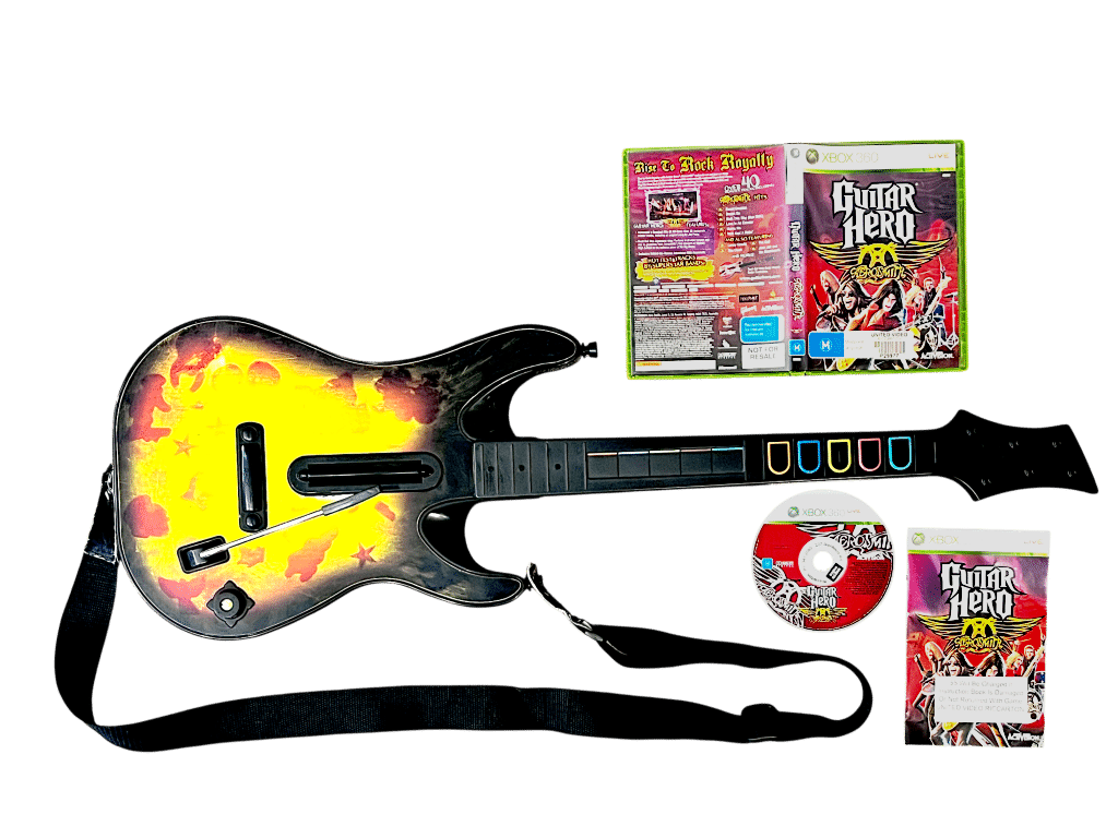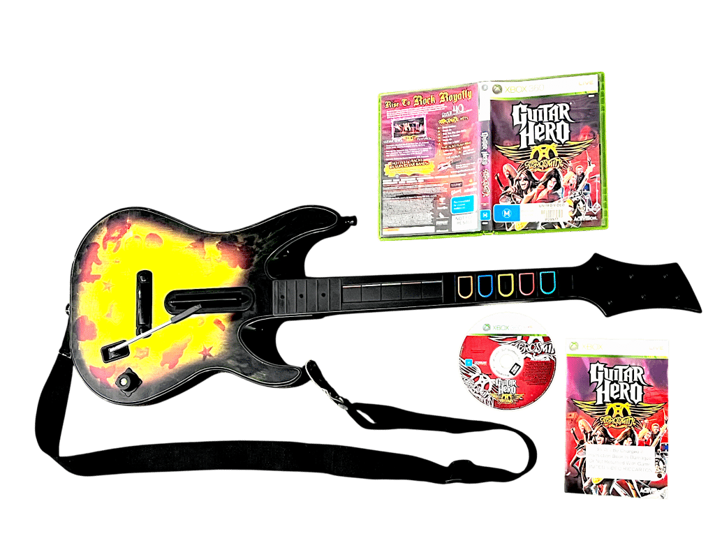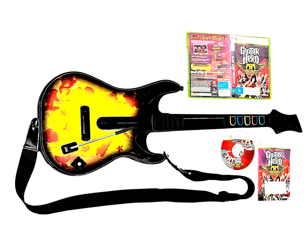 DESCRIPTION: Complete rhythm gaming bundle including Guitar Hero: Aerosmith and a compatible guitar controller for Xbox 360. Jump straight into classic rock gameplay with responsive fret buttons and strum mechanics. Perfect for parties, nostalgic gamers, and collectors of music game peripherals. A highly interactive experience that remains a fan-favourite in the Guitar Hero series.
