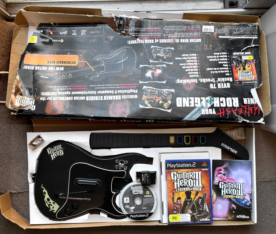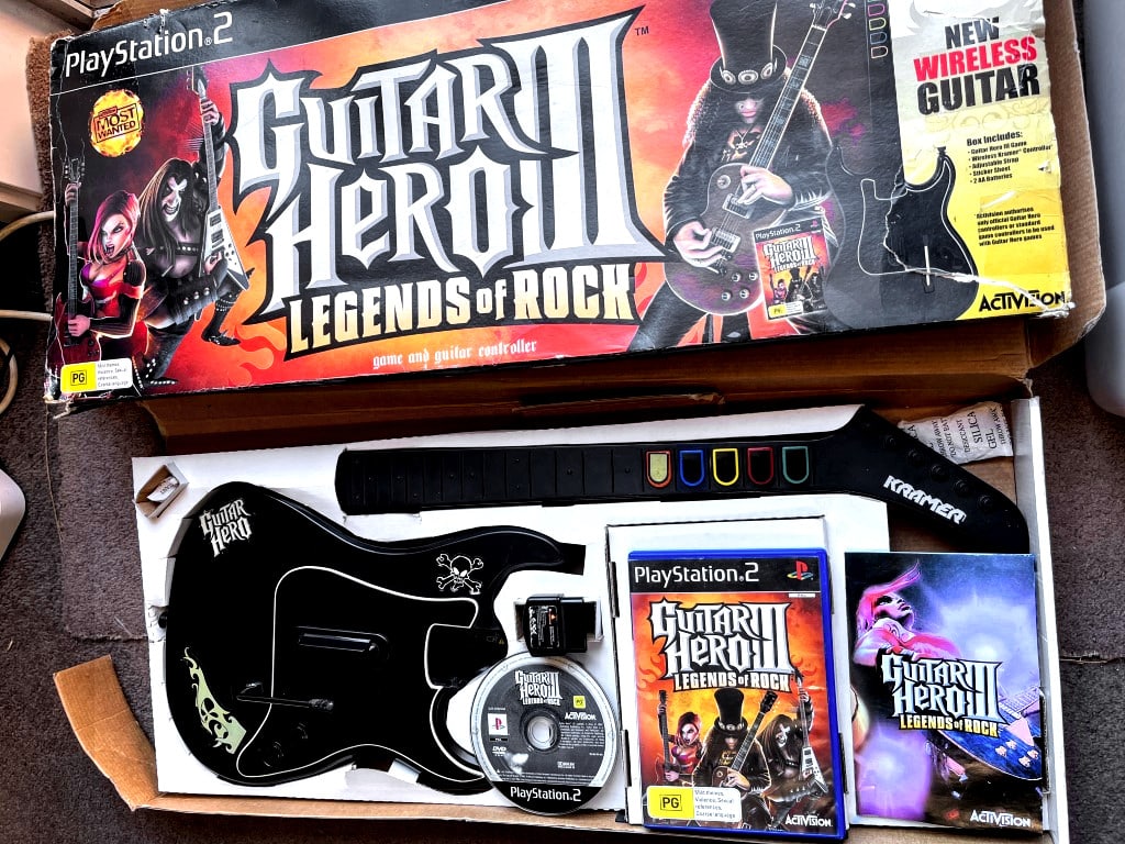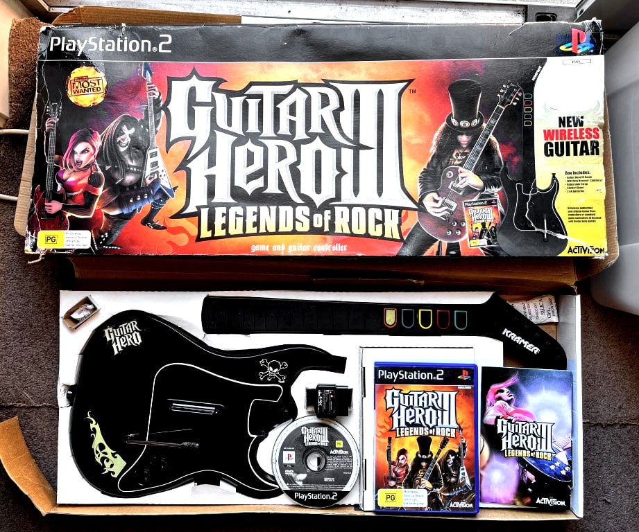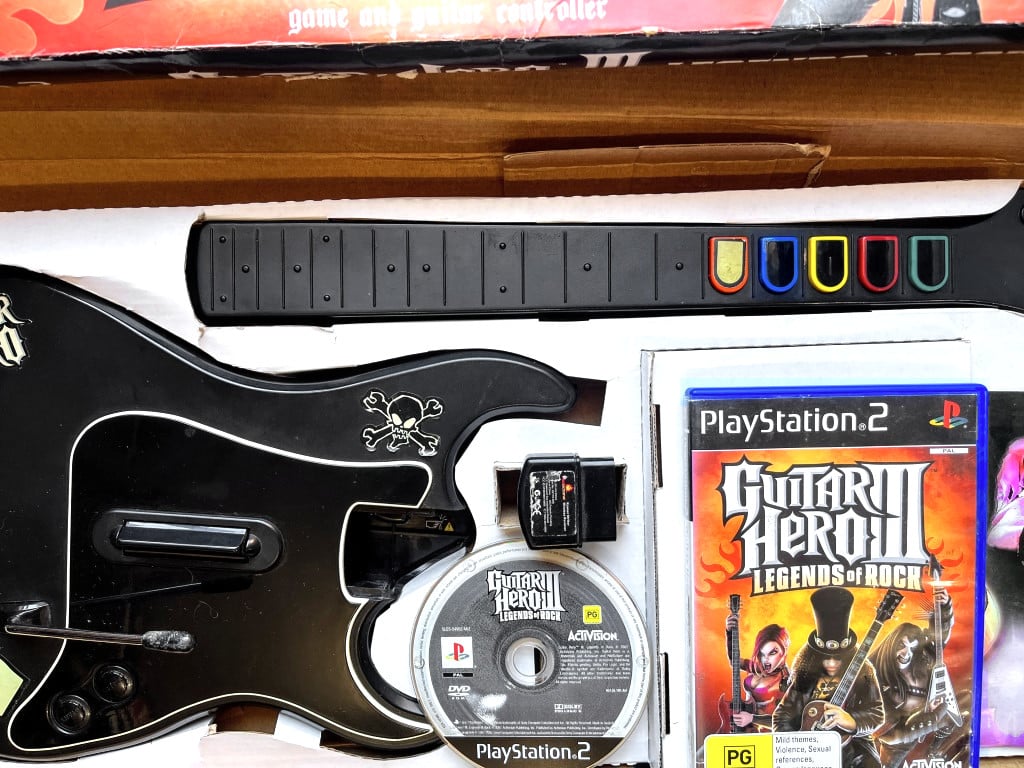 RARE FIND: COMPLETE BOX SET – WIRELESS GUITAR BUNDLE in Good Condition & 100% Complete with ALL 3 COMPONENTS: GUITAR + GUITAR HERO III Legends of Rock (Guitar Hero 3) Game + Wireless USB Dongle / Adapter for SONY PlayStation 2 / PS2. This preowned genuine Wireless Guitar Set is in very tidy condition, with minor superficial markings and cosmetic imperfections only. COMPLETE WITH BOX! Box has card wear pictured, but this does not hinder its functionality, and the inner storage box is in superb condition and contains each of its partitioners pictured to securely store each of the included Guitar Hero components. Refer images. A complete player’s bundle, and a suitable gift.