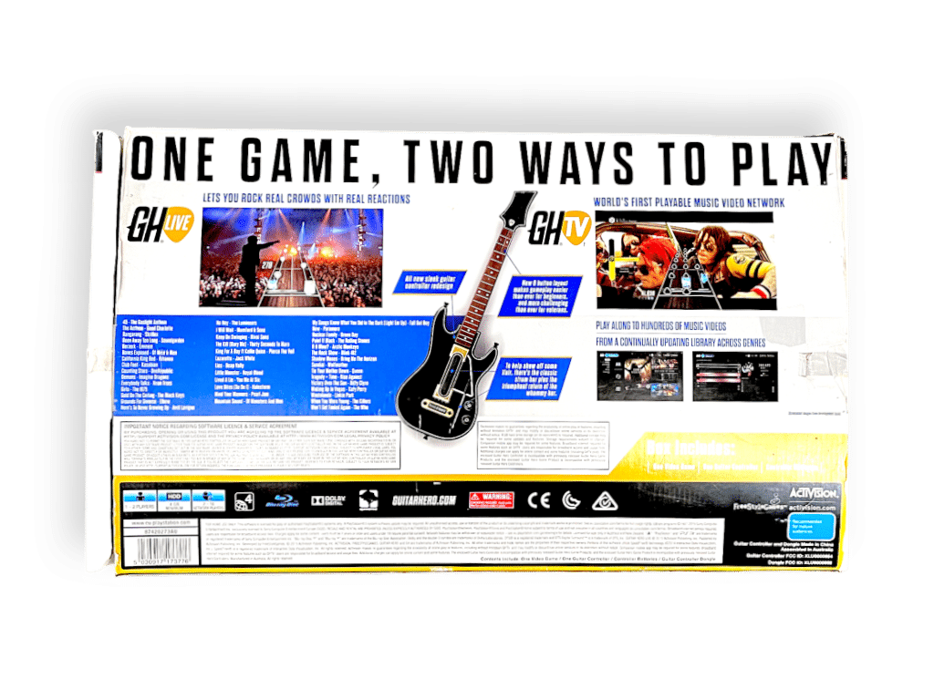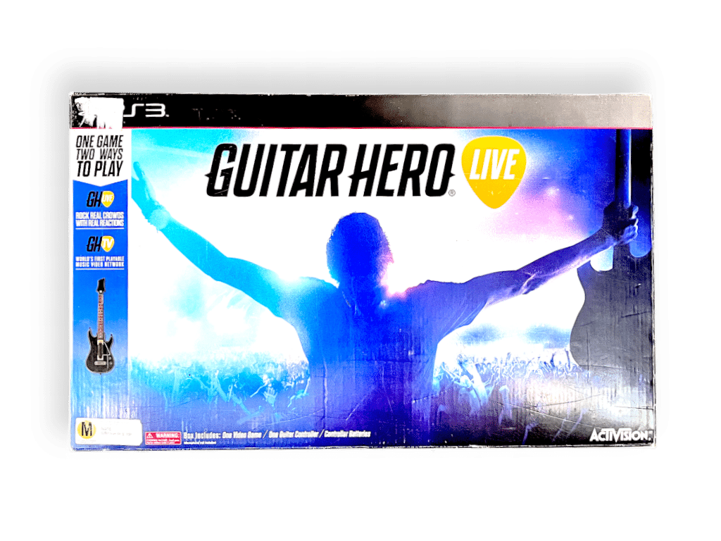 DESCRIPTION: Guitar Hero Live reinvented the rhythm genre with a new live-concert perspective, putting players on stage in front of real crowds that react dynamically to performance quality. The included Bluetooth guitar controller features a modern two-row fret button system for more authentic chord shapes and strumming techniques. The PS3 box set includes the game disc, wireless guitar controller, USB receiver, and instructional inserts. The revolutionary GH Live and GHTV modes allow players to play along to music videos from legendary artists across rock, pop, and metal genres. A perfect collector’s piece for music-game enthusiasts or anyone seeking a nostalgic return to stage-rocking gameplay.