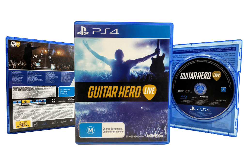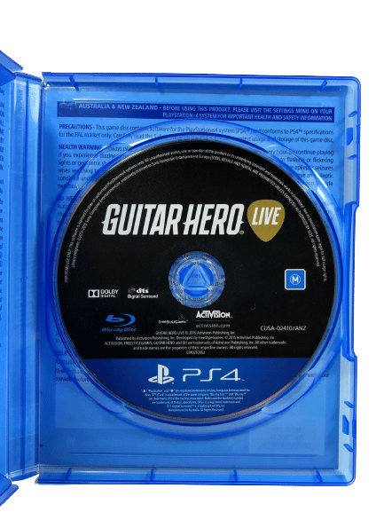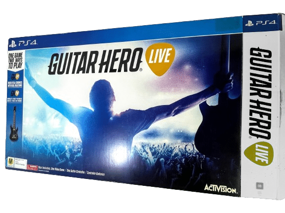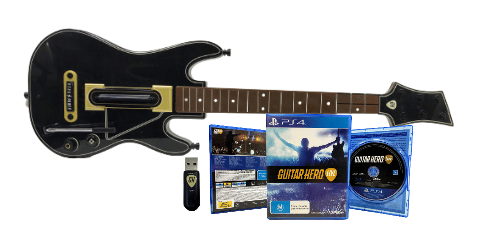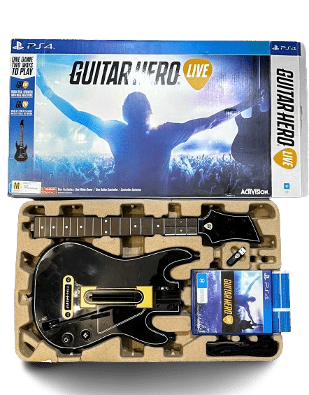 RARE FIND: COMPLETE BOX SET – GUITAR HERO PLAYING BUNDLE (Guitar Hero Live GUITAR + USB ADAPTER + Guitar Hero Live GAME – for SONY PlayStation 4 / PS4. This preowned Official Sony PlayStation 4 Guitar Hero Live guitar bundle is in excellent condition and comes complete with Original Box (Outer Display Box + Inner Partitioner Box) + official Guitar Hero Live Controller (Playing Guitar) + Guitar Strap + USB Wireless Dongle (to sync guitar with PS4 console for wireless game play) + Guitar Hero Live the game. Light markings etc and shelf wear consistent with use, but nothing that hinders performance in any way. Overall, a tidy and complete playing bundle, suitable as a gift. Refer images.