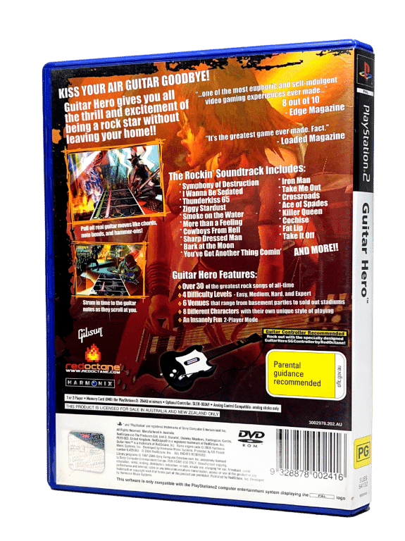 Rare Guitar Hero Game in Excellent Condition & 100% Complete with Contents: GUITAR HERO THE ORIGINAL GAME for SONY PlayStation 2 / PS2. This preowned game is in pristine condition and comes complete with case, cover, manual / booklet, and game disc.
