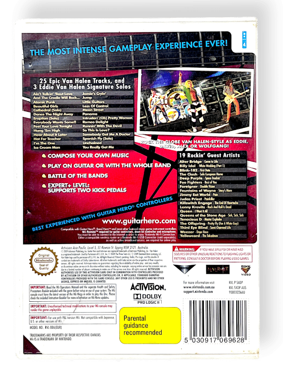 Guitar Hero Van Halen brings to life the flamboyance, virtuosity and unadulterated fun that have made Van Halen one of the most successful and popular rock and roll acts of the past 30 years. The game features 25 classic Van Halen tracks, three signature Eddie Van Halen guitar solos, and 19 hand-picked guest acts. Play in eight original venues specifically designed for Guitar Hero Van Halen. Rock around the globe, from a small club in Los Angeles to arenas around the world.