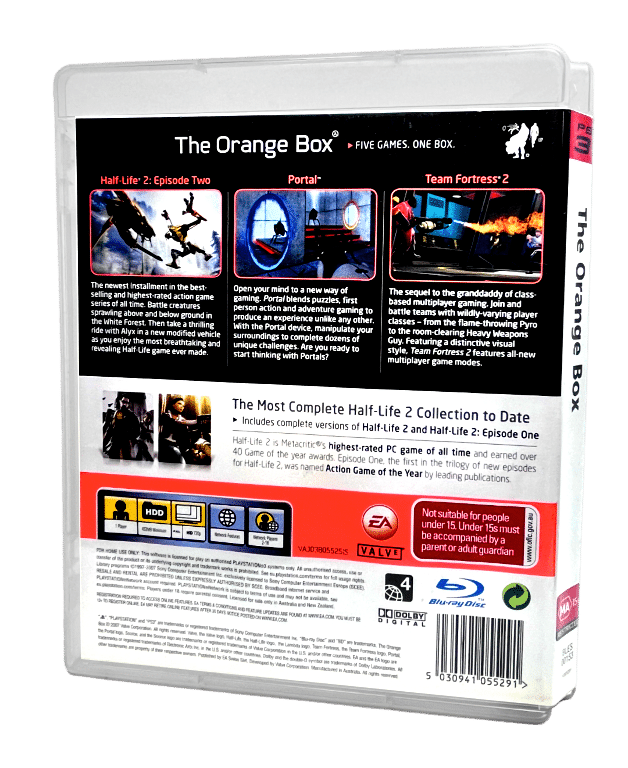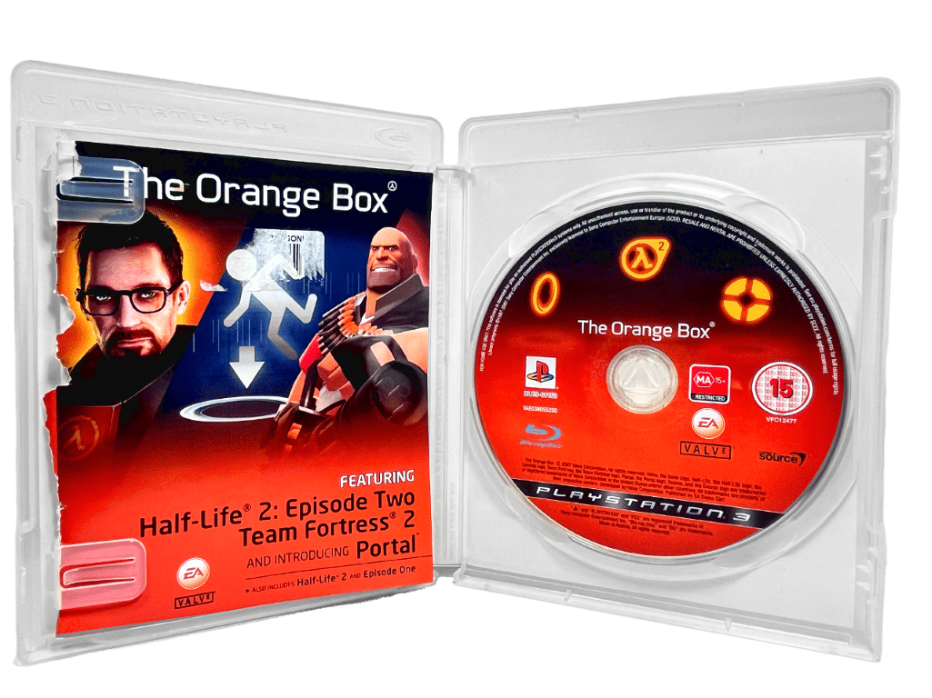 HALF LIFE 2 THE ORANGE BOX for SONY PlayStation 3 / PS3. This preowned game is in excellent condition and comes complete with pictured case, cover, manual / booklet, and game disc. The booklet cover has come off, but the booklet is complete aside from missing the back cover, and all other contents are in pristine condition.