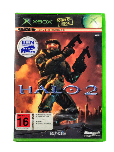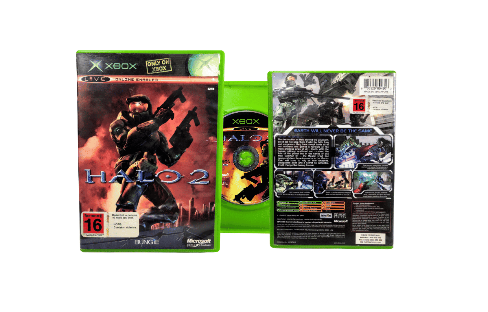 HALO 2 for Original XBox. This preowned game is in good condition and comes complete with original case, cover, instruction manual, booklet, and game disc. Advertising card not included. Game is good with only mild surface scratches that do not hinder performance or gameplay in any way, and the cover + manual are each very tidy.