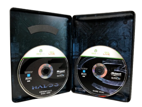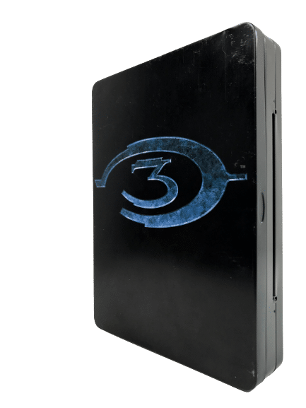 RARE FIND: HALO 3 LIMITED STEEL COLLECTOR’S EDITION for Xbox 360 (and this game also plays on XBox One). This preowned game includes both matching Game Discs – each in excellent condition, inside Steel Tin (LARGE TIN), all inside this special edition’s Official Display Box / Plastic Display Sleeve (also in excellent condition). The tin has some cosmetic imperfections pictured, but the display sleeve and game discs are each in superb condition, and a rare Limited Steel Tin Edition. Add this to your collection today!