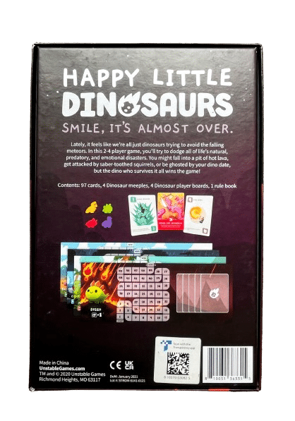 With 97 cards, 4 Dinosaur Player Boards, 4 Dinosaur Meeples, and 1 Rule Book, Happy Little Dinosaurs is a dino-sized adventure waiting to happen. Each round, players draw a Disaster card featuring a Natural, Predatory, or Emotional disaster, and then play a Point card to avoid becoming a fossil while collecting points. Will you survive the clutches of a prehistoric whale or end up dino-sore? The cards hold the answers!