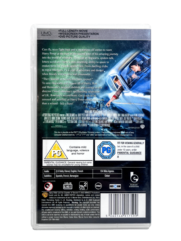 Rare & collectible PSP Movie in excellent condition and 100% complete with contents: Harry Potter & The Chamber of Secrets SONY PSP Movie / PlayStation Portable UMD Movie. This preowned PSP Movie is in excellent condition, and comes complete with case, cover, and movie disc inside its miniature UMD.