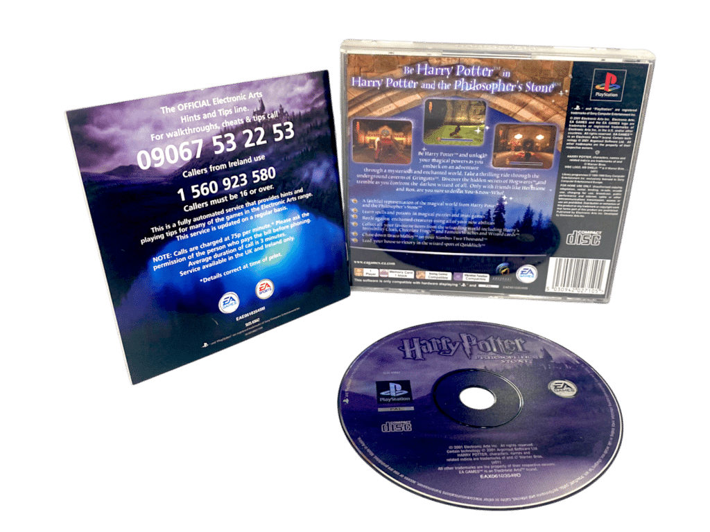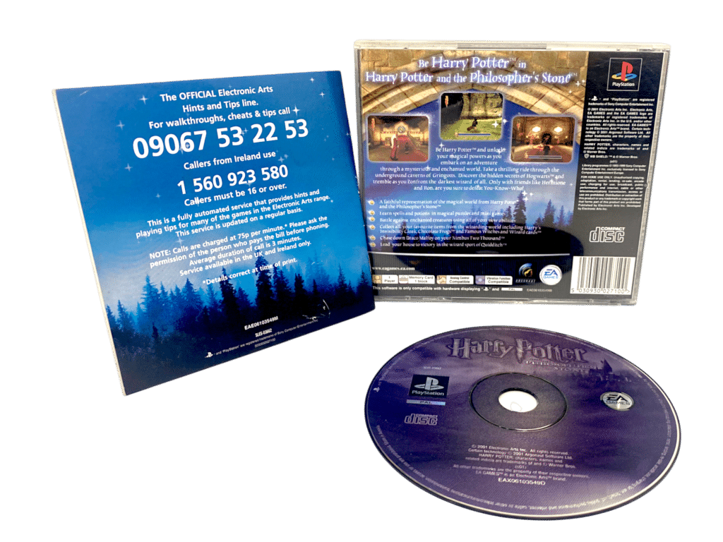 Harry Potter & the Philosopher’s Stone Complete with Manual, Case and Disc (PS1). This preowned SONY PlayStation game (PS1 game) is in very good condition with mild disc surface imperfections only which do not affect gameplay or performance in any way. and includes pictured case + game disc + cover/s + manual / booklet.