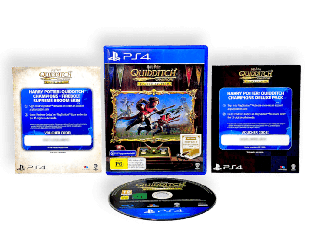 Description: PS4 Deluxe Edition featuring Firebolt Supreme Broom Skin and exclusive voucher codes for in-game rewards. Offers immersive Quidditch gameplay with online multiplayer and team customization. Includes PS5 upgrade option for next-gen performance.