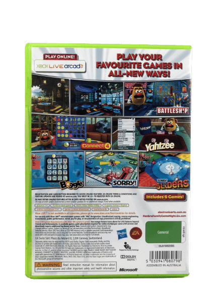 Play the classic Hasbro games your family knows and loves in brand new and fun ways or play by the original rules. Hasbro Family Game Night features classic and party game modes of family favorites such as Connect Four, Battleship, Yahtzee, Boggle, Sorry! and Sorry! Sliders. Players can show off their skills, increase Gamerscores, utilize voice chat and earn Achievements as they compete for a top spot on the Xbox Live Arcade leader boards. *DLC (Downloadable Content) may not be included and is not guaranteed to work*