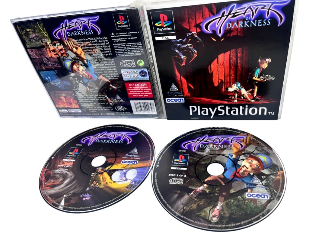 The Original 2 DISC Edition in excellent condition: Heart of Darkness for SONY PlayStation 1 / PS1. This preowned game is the Original Print – in Excellent Condition – with case, covers (both front and reverse cover slips), game disc 1 + game disc 2 on removeable inner plastic panel. Manual not included in this listing.
