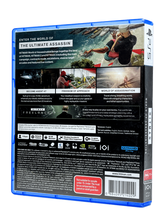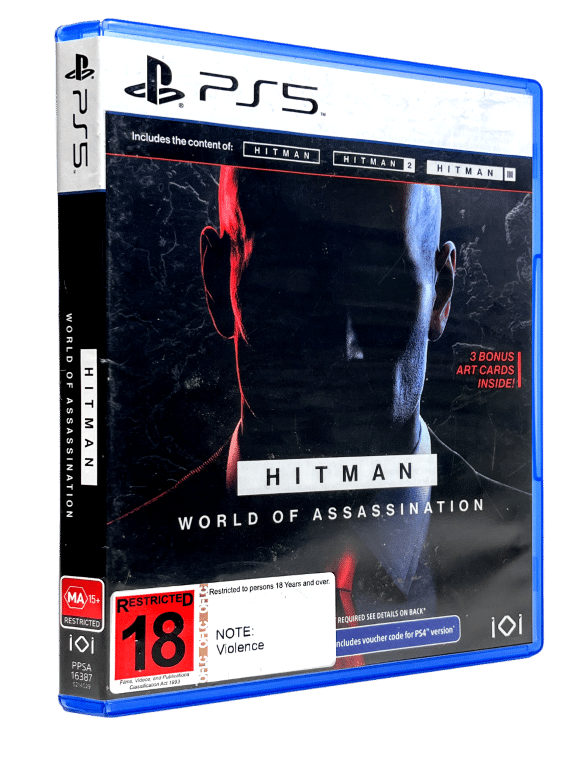 Hitman World of Assassination for SONY PlayStation 5 / PS5. Preowned, but As New and COMPLETE with full game on disc PLUS ALL SPECIAL BONUS CONTENT on downloadable voucher. Game is preowned but in mint condition – disc played through. Bonus downloadable content still new and unredeemed.
