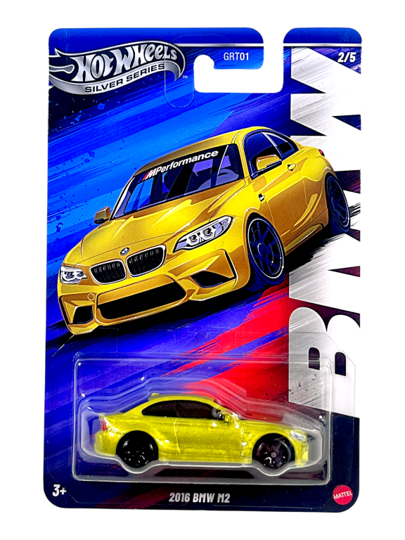 Hot Wheels Silver Series 2016 BMW M2 showcases brilliant yellow M Performance livery with authentic BMW M Division styling cues. Premium die-cast metal construction captures the compact performance coupe’s aggressive design with detailed kidney grille and M-specific aerodynamics. Part of exclusive Silver Series celebrating modern performance vehicles. Features accurate M2 proportions with wide stance and performance wheel design. The 1:64 scale model represents BMW’s commitment to driving dynamics in accessible format. Collectible number GRT01 2/5 appeals to BMW enthusiasts seeking contemporary M car representation in premium collectible quality.