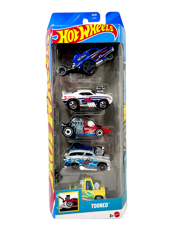 DESCRIPTION: The Hot Wheels Tooned 5-Pack delivers exaggerated cartoon-style versions of classic Hot Wheels vehicles. With oversized engines, chunky wheels, and compact stylised proportions, these playful designs bring a humorous twist to die-cast racing cars. The Tooned series has become popular with collectors thanks to its distinctive caricature-inspired styling. Each pack contains five uniquely designed vehicles, offering great variety for racing, display, or imaginative play. Perfect for younger Hot Wheels fans and collectors who enjoy quirky automotive designs, the Tooned pack stands out with its bold colours and fun personality.