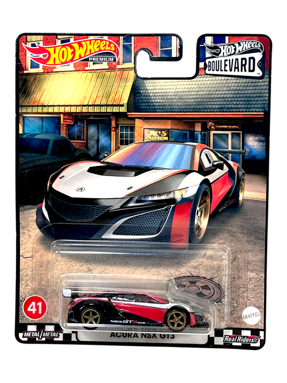 DESCRIPTION: The Hot Wheels Boulevard Acura NSX GT3 represents the track-focused racing version of Acura’s modern supercar. Designed for international GT racing competition, the NSX GT3 combines lightweight construction with advanced aerodynamics and a powerful twin-turbo engine. Hot Wheels recreates the aggressive stance and race-inspired styling in premium die-cast form with Real Riders rubber tyres and detailed graphics. The Boulevard series is known for high-quality collector releases that highlight iconic automotive culture. A fantastic model for fans of modern racing machines and Acura’s high-performance heritage.
