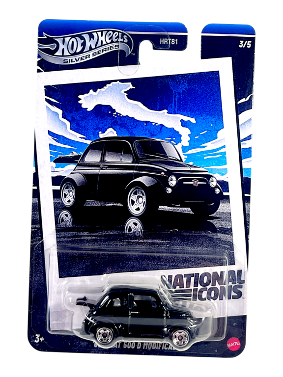 Hot Wheels Silver Series Fiat 500 D Modificata showcases Italy’s beloved city car with authentic black finish and classic European styling. Premium die-cast construction captures the iconic 1960s design with accurate proportions and period-correct details. Part of National Icons series honoring culturally significant vehicles worldwide. Features detailed wheels matching the modified street appearance and authentic Fiat badging. The 1:64 scale model represents Italian automotive charm and customization culture. Collectible number HRT81 3/5 celebrates European motoring heritage for collectors appreciating classic compact car design and modification artistry.