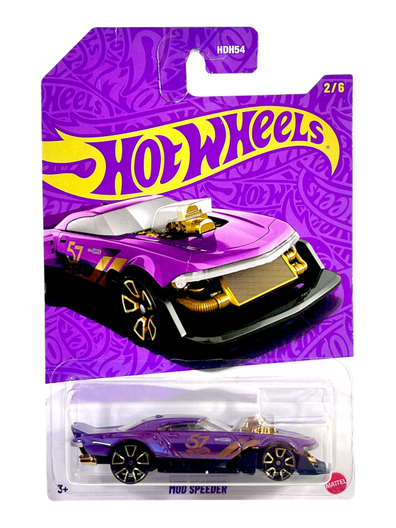 Hot Wheels Mod Speeder showcases radical custom hot rod design with vibrant purple metallic finish and gold chrome detailing. Features futuristic styling combining classic hot rod elements with modern interpretation including exposed engine and aggressive body modifications. Die-cast construction with premium paint and detailed graphics including custom number 34 livery. Part of imaginative custom vehicle series pushing creative boundaries. The exaggerated proportions and show-car stance deliver maximum visual impact in 1:64 scale. Collectible number HDH54 2/6 represents Hot Wheels’ commitment to wild custom designs for collectors embracing unconventional automotive artistry.