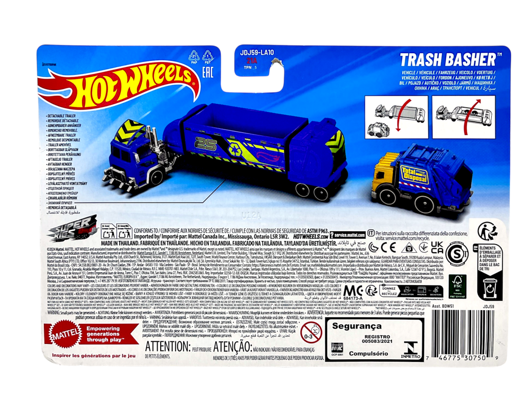 DESCRIPTION: The Hot Wheels Super Rigs Total Disposal Transport features a detailed waste-management themed truck hauling a matching vehicle. Like other sets in the Super Rigs series, the truck is oversized and designed with bold colours, racing graphics, and working transport features. Kids can load and unload vehicles while imagining exciting road adventures, while collectors appreciate the unique truck designs within the Hot Wheels lineup. Super Rigs have become a popular sub-series thanks to their impressive size compared to standard Hot Wheels cars. A fun addition to any Hot Wheels collection or toy vehicle display.