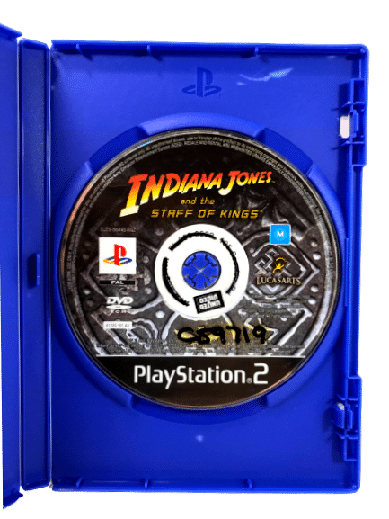 INDIANA JONES & THE STAFF OF KINGS for SONY PlayStation 2. This preowned game is in very good condition and includes case, cover, and game disc.