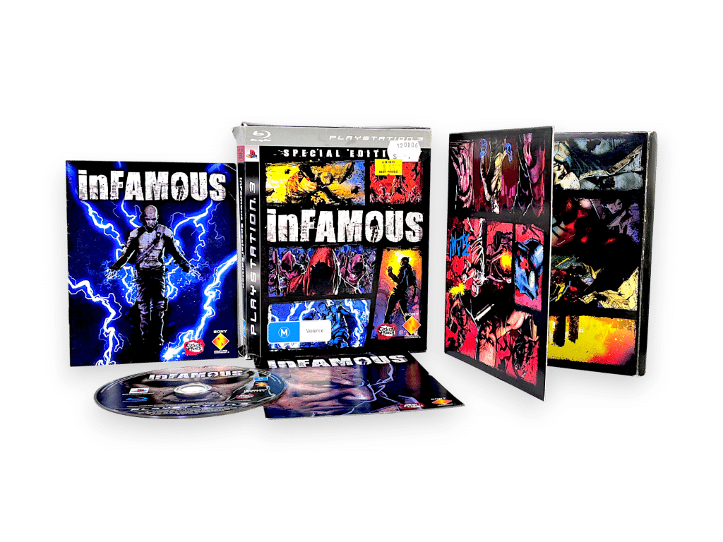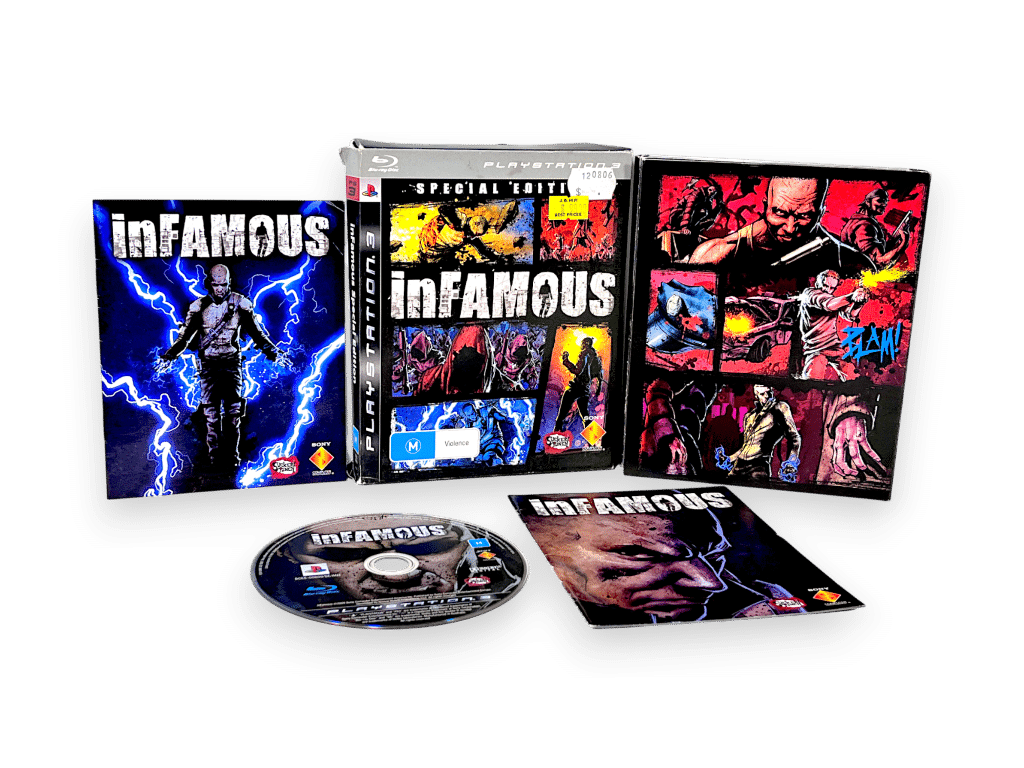 RARE SPECIAL EDITION – Boxed Collector’s Limited Edition: Infamous for SONY PlayStation 3 / PS3. This preowned authentic limited release features the original INFAMOUS game complete with outer Display Box + Inner Display / Stoage Box – segmented display box (box folds out to reveal artwork and compartments) + manual / booklet + Artbook + game disc. All inner contents are in superb condition – the Inner box + manual + artbook. The game disc is good with only mild disc surface imperfections. The outer display box features some light card wear pictured, but is still striking in appearance as pictured. A lovely collector’s bundle. Refer photographs.