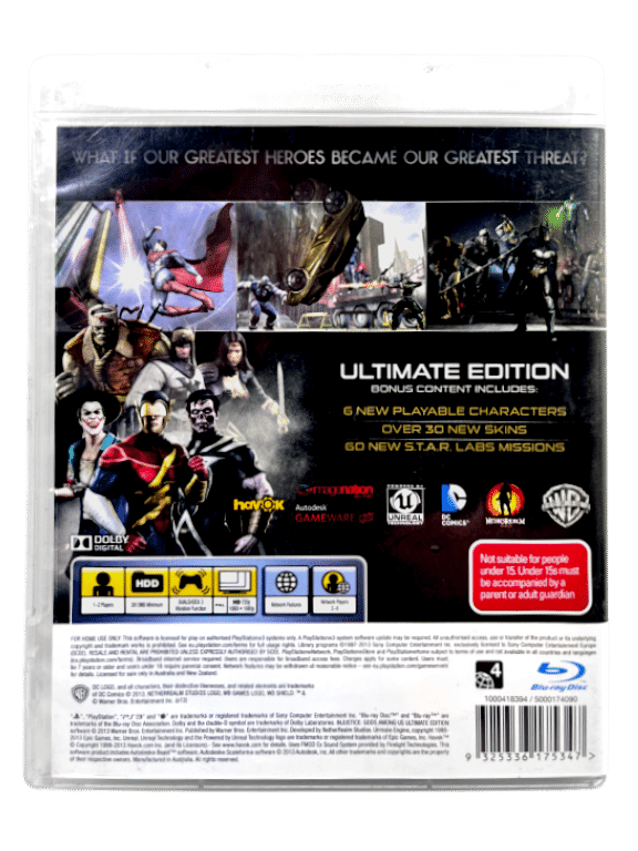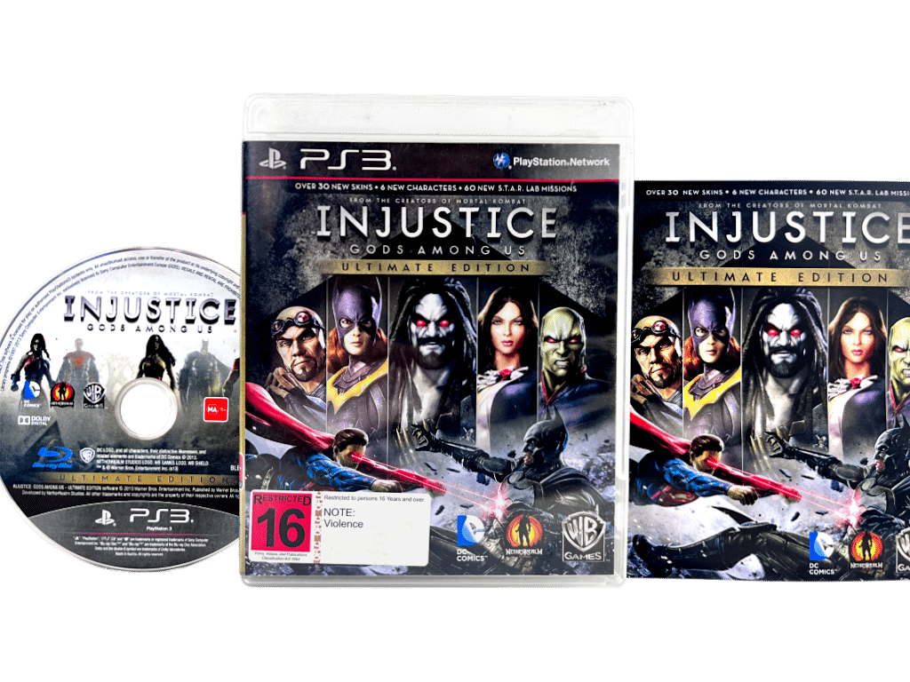 RARE FIND: The Official PS3 ULTIMATE EDITION (WITH BONUS CONTENT) in excellent condition & 100% complete with contents, including Official Ultimate Edition Game Disc: INJUSTICE GODS AMONG US ULTIMATE EDITION for SONY PlayStation 3 / PS3. This preowned game comes complete with case + cover + manual / booklet + game disc.