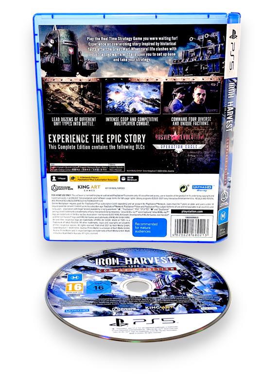 Iron Harvest 1920+ Complete Edition (PS5). This preowned SONY PlayStation 5 game (PS5 game) is in excellent condition and complete with original case + cover + game disc. Note that this game is preowned so any single use voucher codes are not included, but these were promotional downloadable add-ons only and are not required for gameplay or completion. The full Iron Harvest game is included on the included game disc.