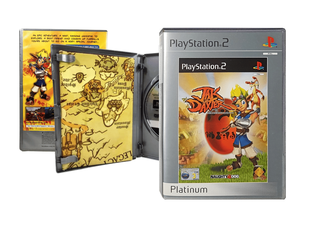 Jak & Daxter The Precursor Legacy for SONY PlayStation 2 / PS2. This preowned game is in good condition with only mild markings and faint scratches, and comes complete with case + cover + Instructional Poster + promo card + game disc.