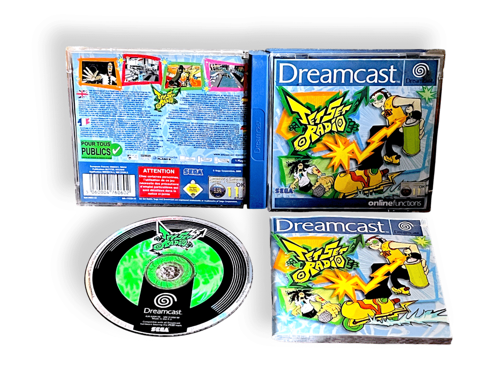 Jet Set Radio (Dreamcast – PAL REGION) *EXCELLENT & COMPLETE*. This pre-owned genuine Sega Dreamcast game is in excellent condition and complete with original case cover, instruction manual, and game disc. The front plastic panel has become loose from the case due to a tiny plastic hinge breaking off, but this is a purely cosmetic imperfection, and everything inside is superb.