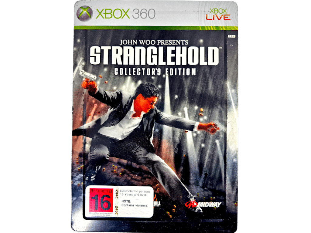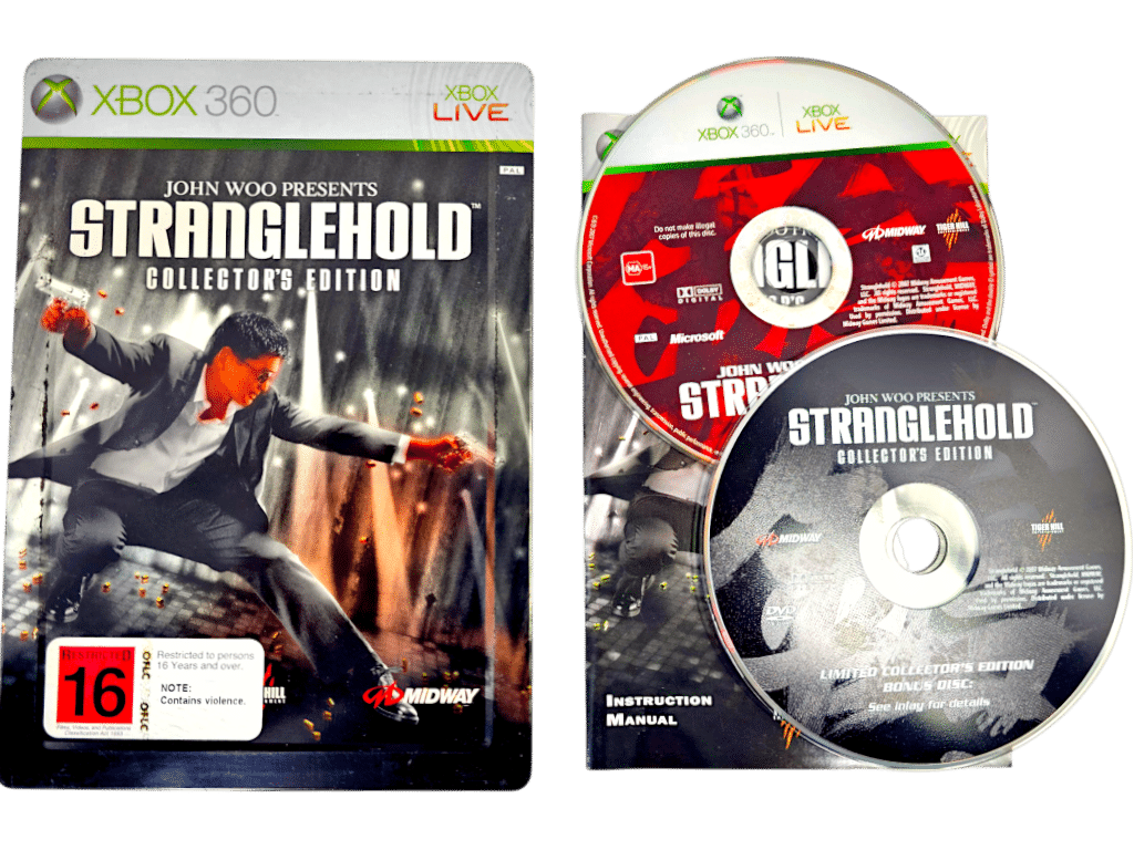 RARE STEEL TIN Limited Collector’s Edition in MINT Condition & 100% Complete with Contents: JOHN WOO PRESENTS STRANGLEHOLD COLLECTOR’S EDITION (LIMITED STEEL EDITION) for Xbox 360. This preowned authentic Limited Release is a large collector’s Steel Case / Steelbook bundle – in pristine condition. This was traded in to our store by a former game store owner, who received pre-releases and limited editions during his tenure in gaming retail. This collector recently traded in a large portion of his entire gaming collection, and this Limited John Woo Stranglehold release was part of that collection.