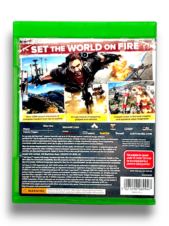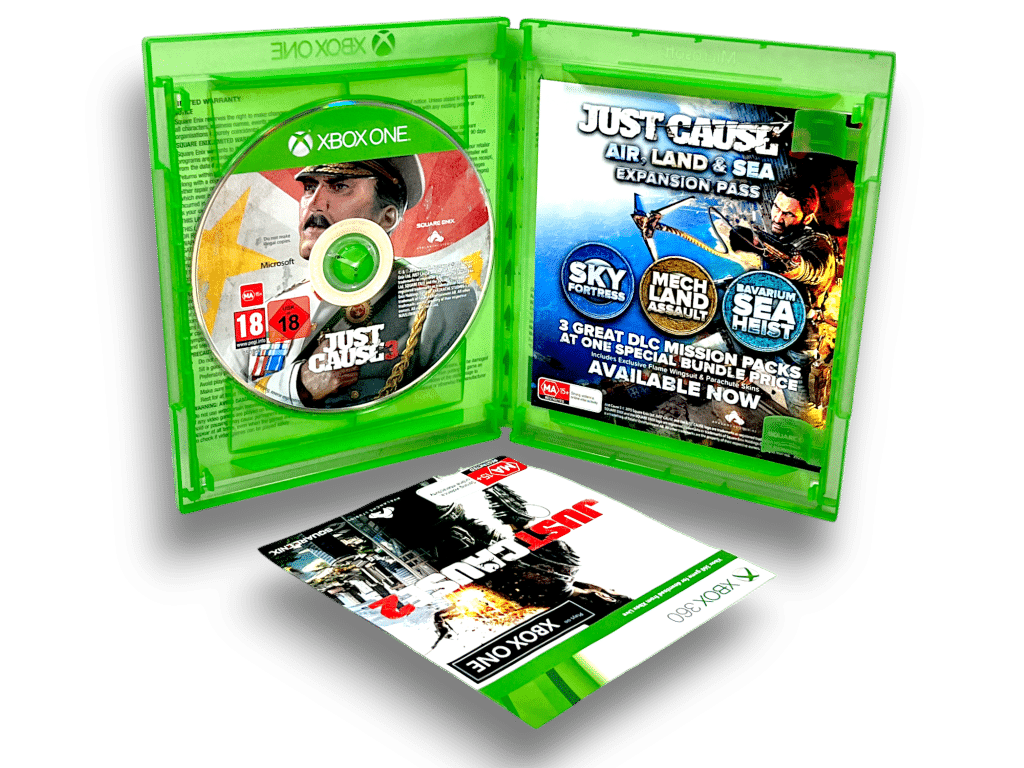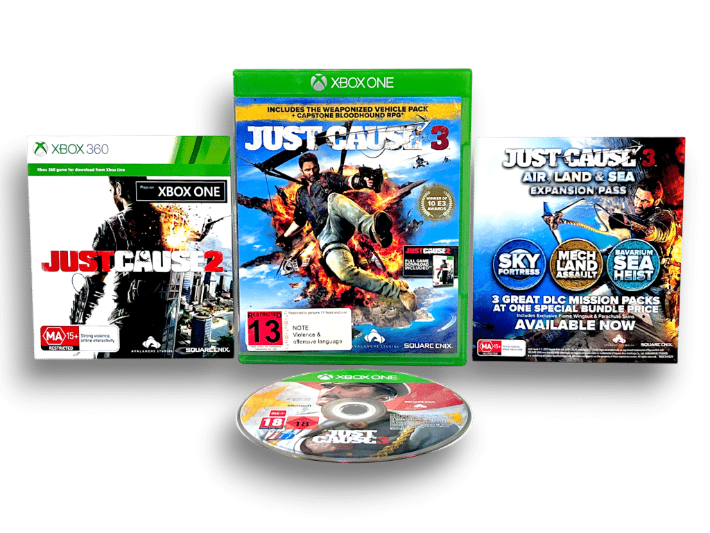 Just Cause 3 Weaponised Limited Edition with Yellow Banded Cover Art (Xbox One). This preowned Xbox One game is in excellent condition and complete with pictured contents. Note that any single use paper vouchers will have expired, but these were promotional downloads only and are not required for gameplay or completion. The full Just Cause 3 game is included on the game disc.