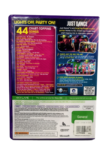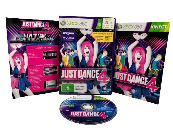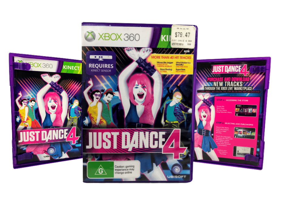 RARE Dance Game in Mint Condition & Complete with Manual: JUST DANCE 4 / Just Dance IV for XBox 360. This preowned game is a tidy, complete, collector’s item, in the original print. Please note listing is the European PEGI Print.