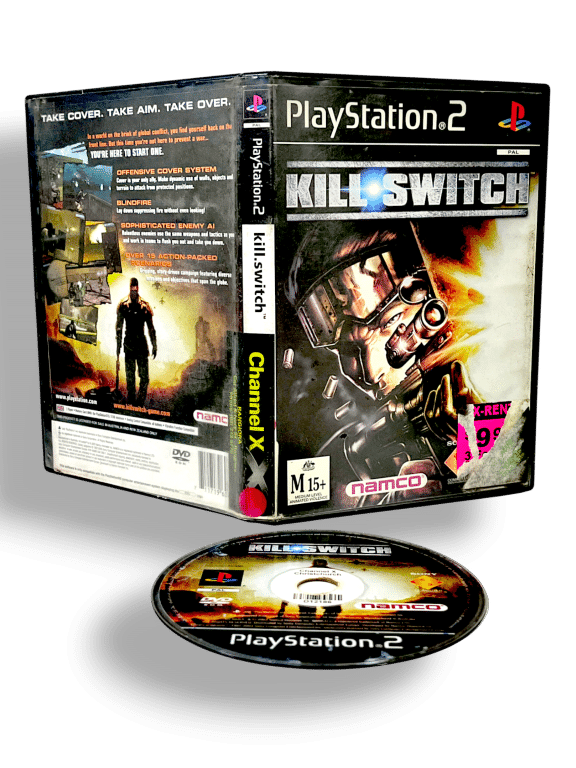 KILL SWITCH: TAKE COVER, TAKE AIM, TAKE OVER (Kill.Switch) for SONY PlayStation 2 / PS2. This preowned game is in very good condition, with very mild disc surface imperfections only which does not hinder performance or game play in the slightest. Includes pictured case + cover. Ex-rental game.