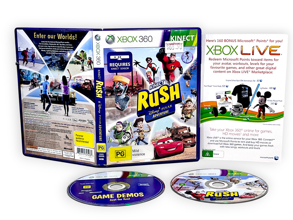 Kinect Rush: A Disney Pixar Adventure (Xbox 360). This preowned game is in good condition with mild disc surface imperfections only which do not hinder gameplay or performance in any way. This game includes pictured contents. Refer photographs.