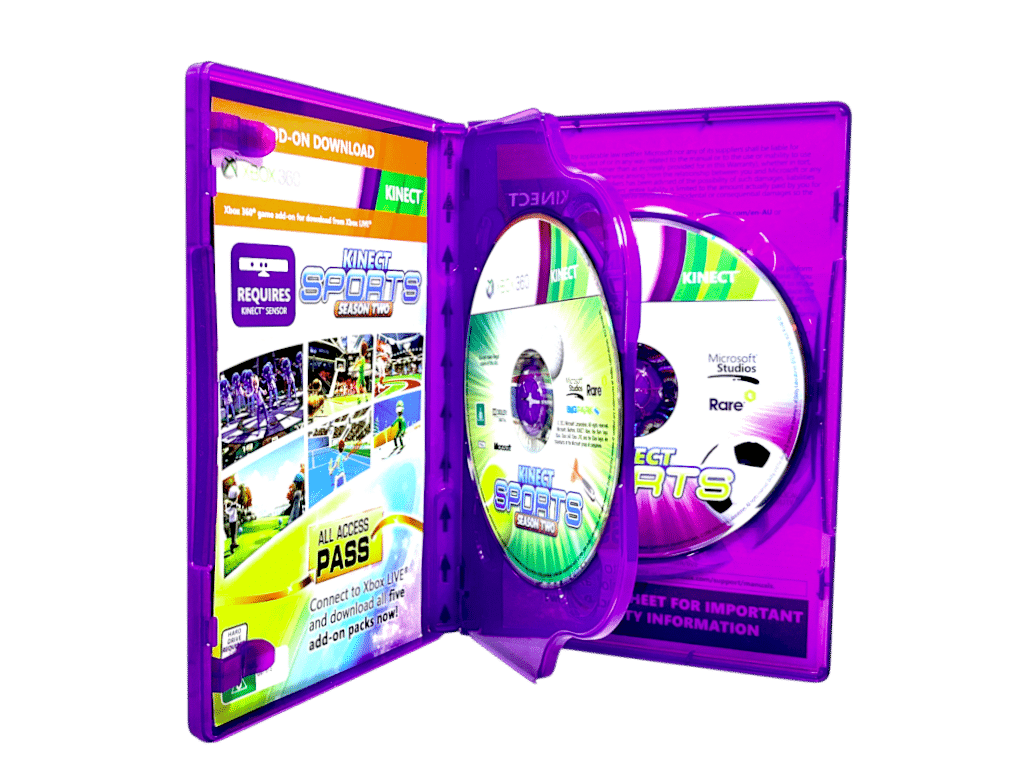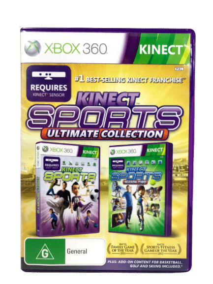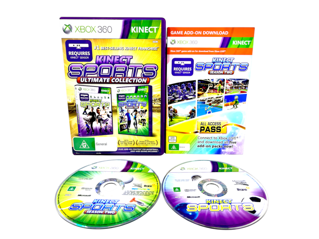 The Kinect Sports ULTIMATE COLLECTION featuring Kinect Sports SEASON TWO and Season One *2 GAME BOX SET* for XBox 360. This preowned game is in good condition – discs with only mild surface imperfections, and game complete with case, cover, promo card, and BOTH game discs (Kinect Sports Season 1 PLUS Kinect Sports Season 2).
