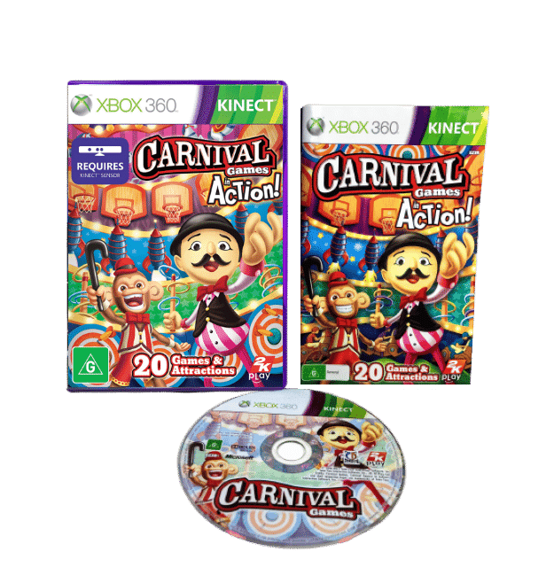 Excellent condition & 100% complete with contents: CARNIVAL GAMES IN ACTION for Xbox 360. This preowned game is in superb condition and comes complete with case + cover + manual / booklet + game disc. Everything near-mint.