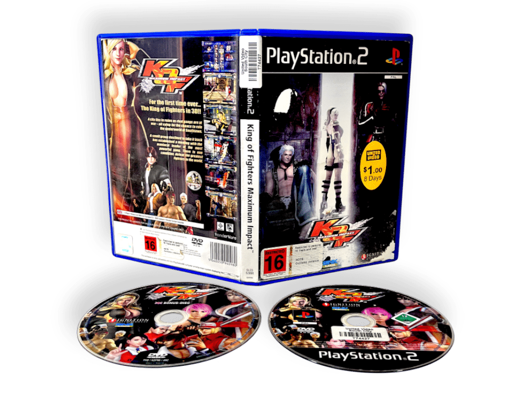 RARE 2 DISC SPECIAL EDITION – both discs in good condition: King of Fighters Maximum Impact for SONY PlayStation 2 / PS2. This preowned game includes case, cover, and game disc, PLUS Special Bonus DVD Disc. Each disc in very good condition with mild disc surface imperfections only. Cover shows some paper wear as pictured, but this is purely cosmetic. Refer photographs.