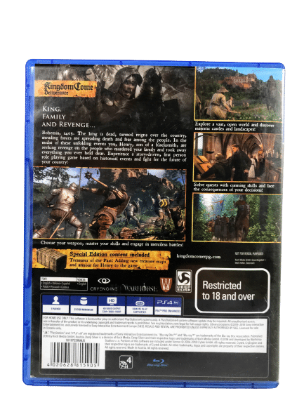 Mint condition & 100% complete with contents: KINGDOM COME DELIVERANCE for SONY PlayStation 4 / PS4. This preowned game comes complete with case, cover, and game disc. Any single use paper voucher codes will have expired, but these were purely promotional and are not required for gameplay or completion. The full Kingdom Come Deliverance game is included on the game disc. A tidy and complete collector’s item.